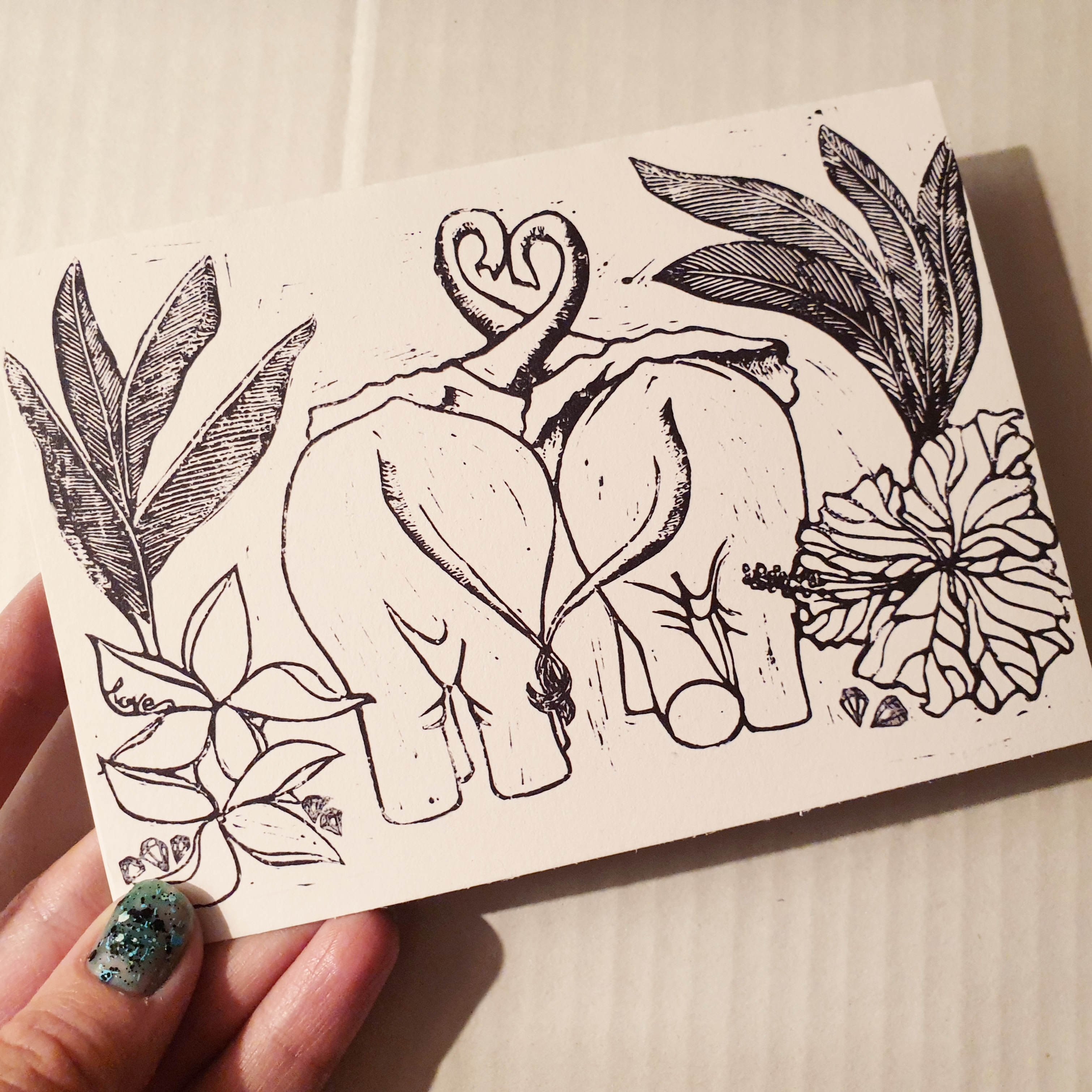 Original lino prints, watercolours, digital illustrations; digitally printed on to recycled card, paired with a recycled envelope, and packed in a biodegradable cellophane wrapper or sealed with a card catcher.